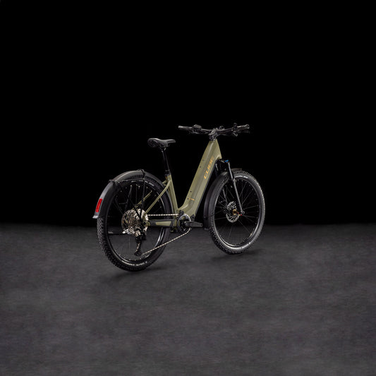 • Das CUBE Reaction Hybrid Pro 800 Allroad Easy Entry 2025 in staubigem Oliv und Gold ist ein modernes E-Bike mit dicken Reifen, Vorderradfederung, schwarzen Schutzblechen, einem Durchstiegsrahmen und hydraulischen Scheibenbremsen für zuverlässigen Halt. Markenname auf dem Rahmen sichtbar.