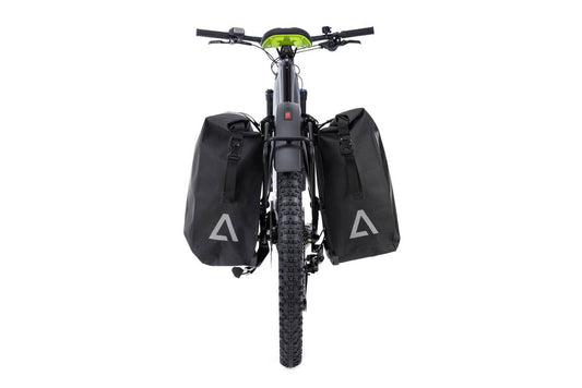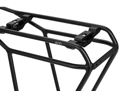 • Der ACID Gepäckträger LOWRIDER Suspension MTB black front rack von ACID verfügt über zwei Seitenstützen und Befestigungspunkte für Packtaschen oder Ladung. Erhältlich im CUBE Store Göttingen oder Hildesheim. Abgebildet auf weißem Hintergrund.