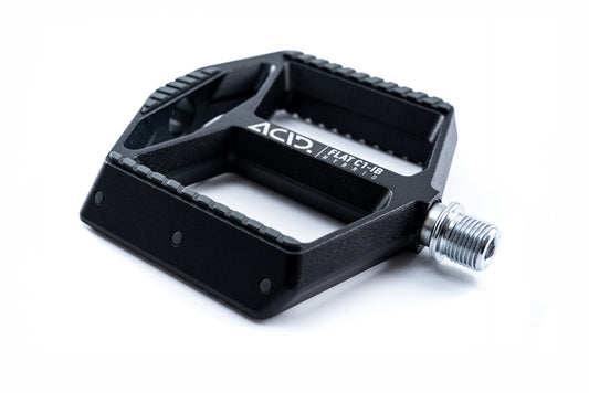 • Das ACID Pedale FLAT A2-IB Hybrid R schwarz von ACID verfügt über einen breiten, sechseckigen CNC-gefrästen Körper, strukturierte Kanten für besseren Halt und eine Metallspindel, die auf einem schlichten grauen Hintergrund dargestellt ist.